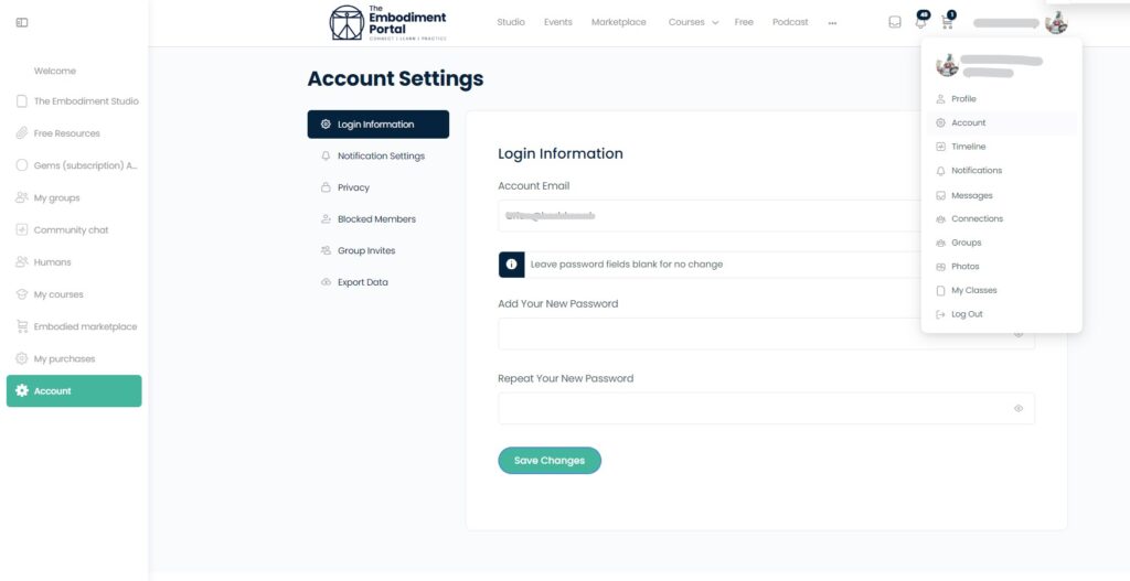 After logging in to any Embodiment Unlimited account (members or courses), (KB article) navigate to ‘Account settings’ and change your password under ‘Login Information’ then click on ‘save’